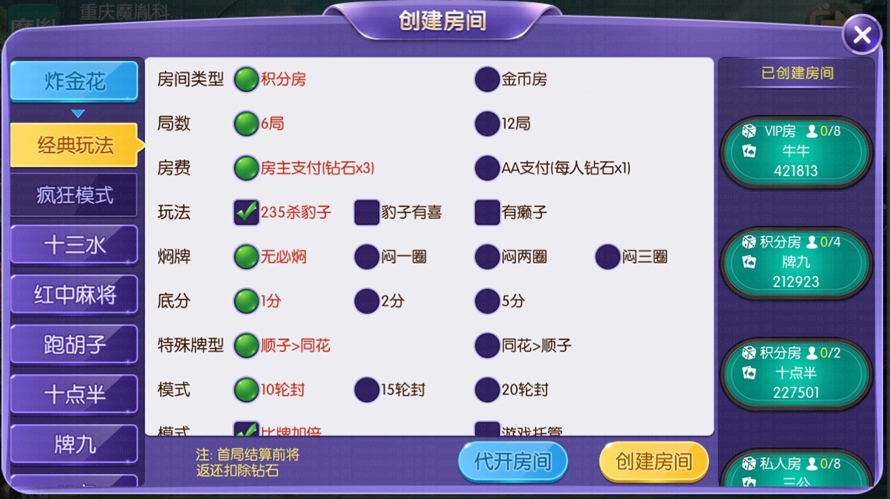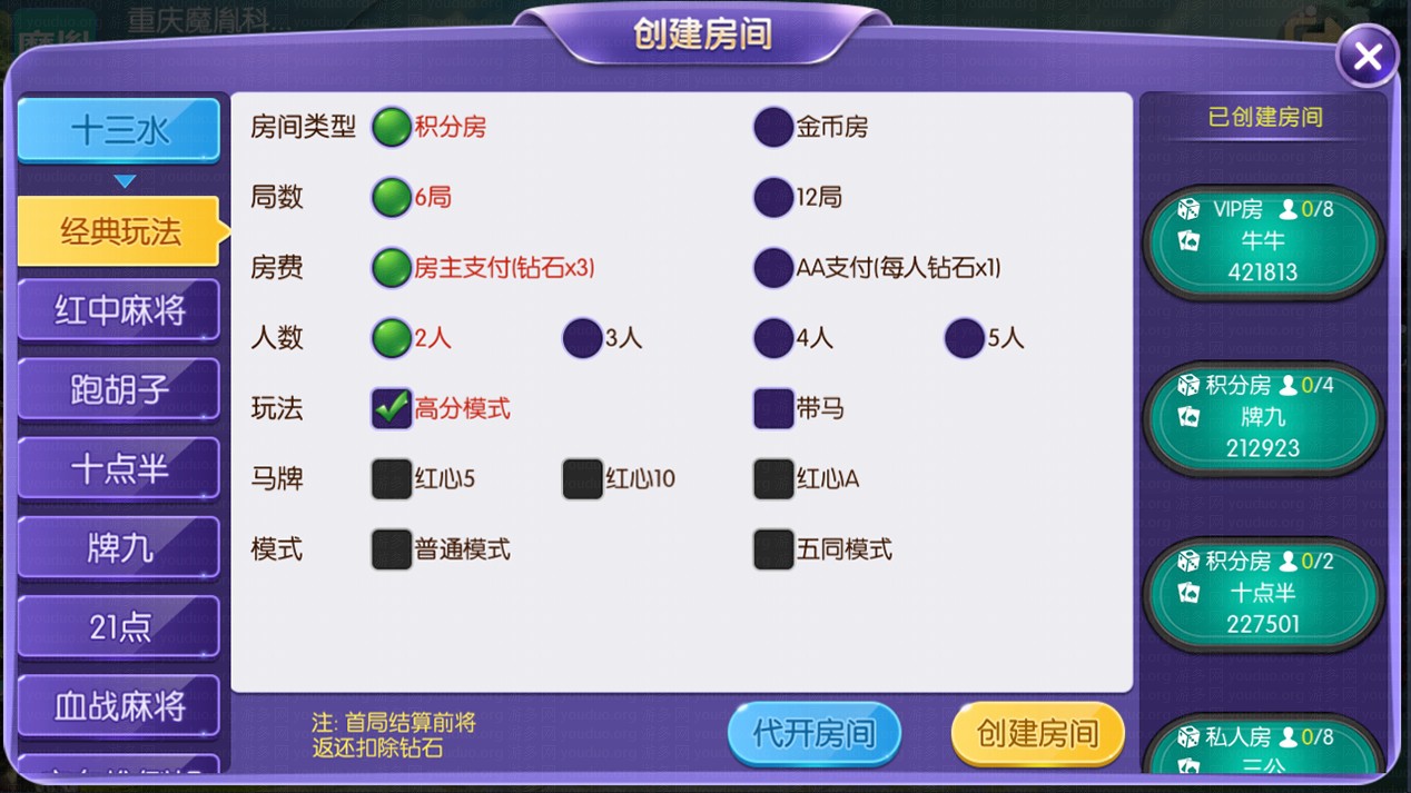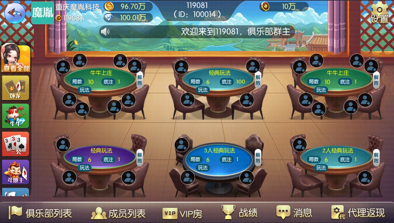 玩法支持积分房、以及金币房,带大联盟亲友圈,支持VIP房,平台还包括玩家代理返现功能,有助提升推广模式策略。