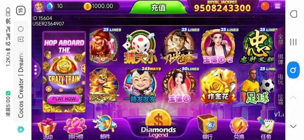 大厅内含有84多款游戏,分为棋牌、电玩、拉霸类型游戏,玩家还可以参与彩金奖池玩法。大厅的菜单简介:含充值、兑换金币,做任务领取奖励等活动功能。