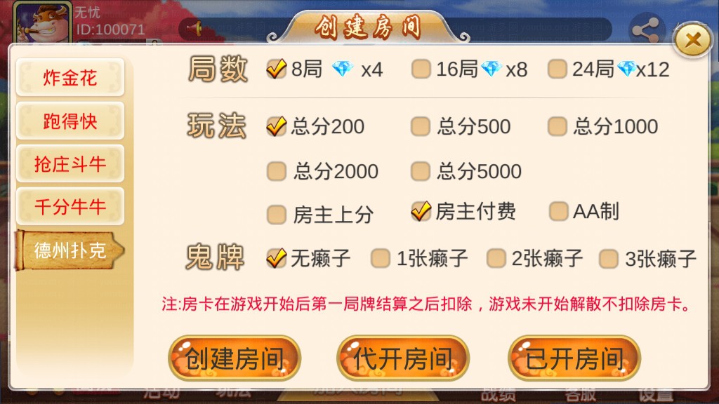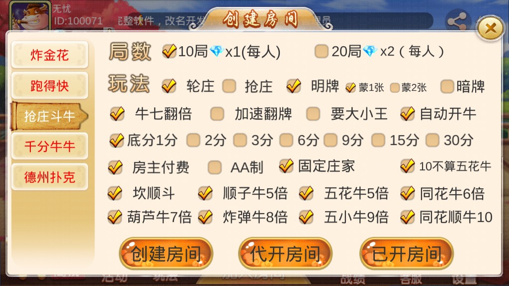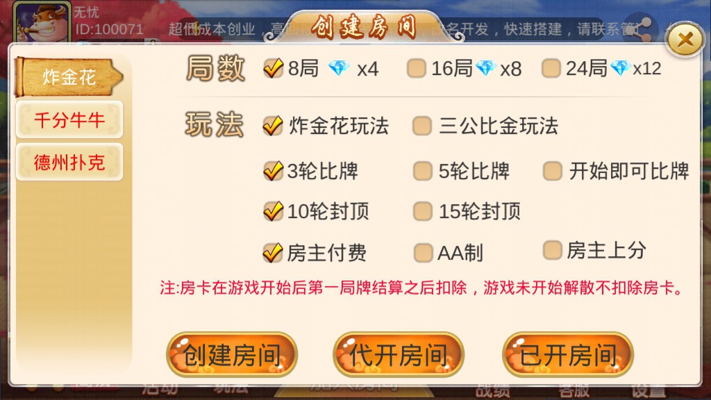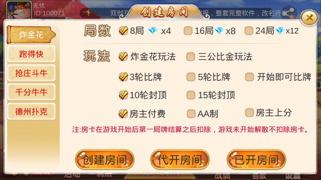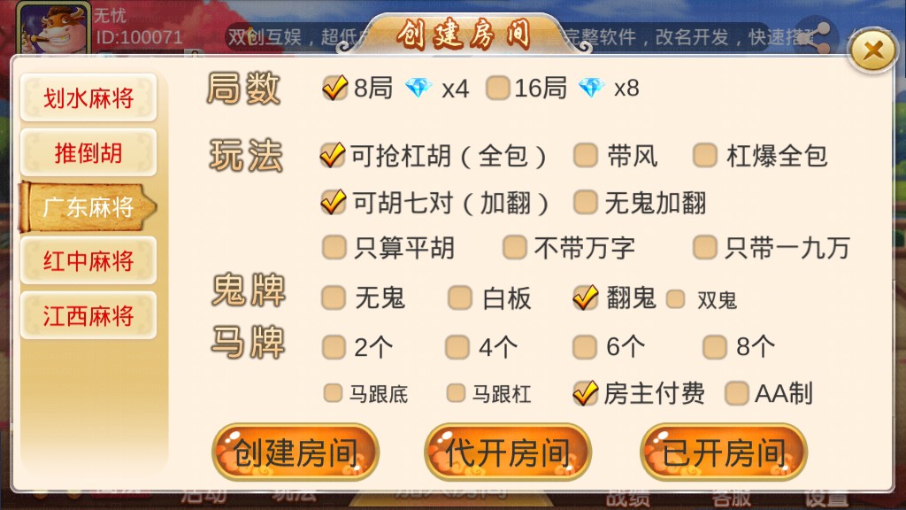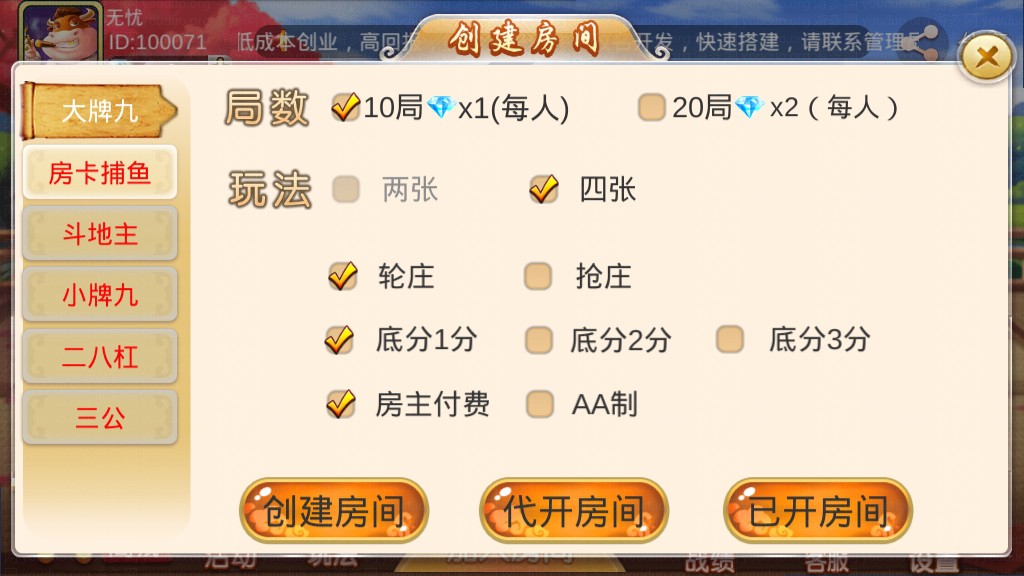 全新双创互娱平台源码,属于完整运营版本,服务端由JAVA开发、前端由unity3D开发,支持房卡场、金币场模式,带有俱乐部,全部功能完整,后台可以开启控制,前端自由选牌,双创互娱分别有多款游戏,包括划水麻将、推倒胡、广东麻将、江西麻将、红中麻将、炸JH、抢庄斗N、千分NN、跑得快、德州扑克、大P九、房卡捕鱼、斗地主、二八杠、小牌九等游戏。平台自带每日签到送房卡功能。