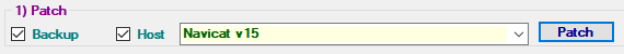 在激活工具的第一个选项(1.Patch)里选择Backup,Host,Navicat 是那个版本就选那个版本,这里就选择Navicat V 15,然后点击,Patch按钮,选择Navicat的安装位置中的navicat.exe文件,如图: