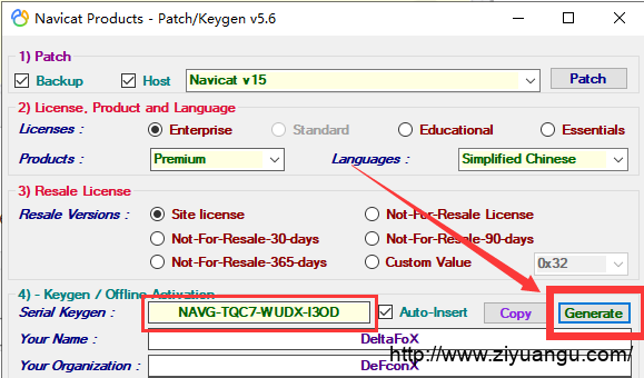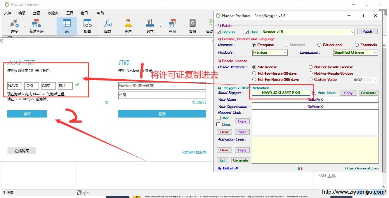 点击Generate按钮就会生成一个许可证秘钥,将许可证秘钥复制后就打开Navicat Premium 15